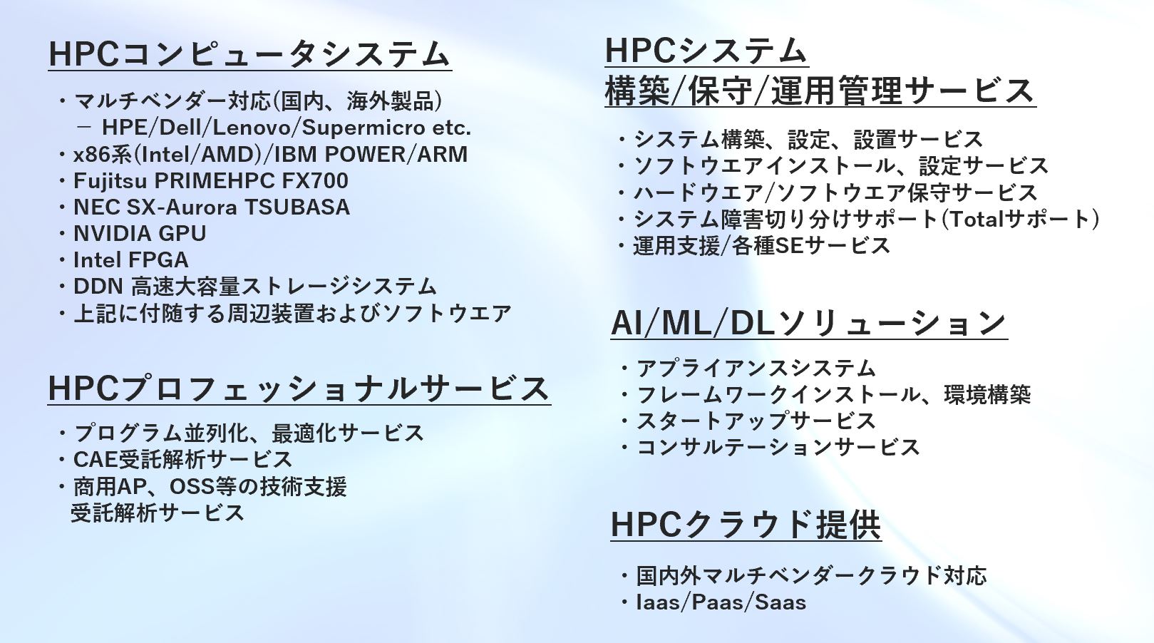 科学技術計算機(HPC/High Performance Computing ハイパフォーマンスコンピューティング)AI/DL向けシステムの製造・エンジニアリングサービスなら当社にご相談下さい。「HPCコンシェルジュ」として、長年培った技術をベースとした高付加価値サービスをワンストップでご提供します。