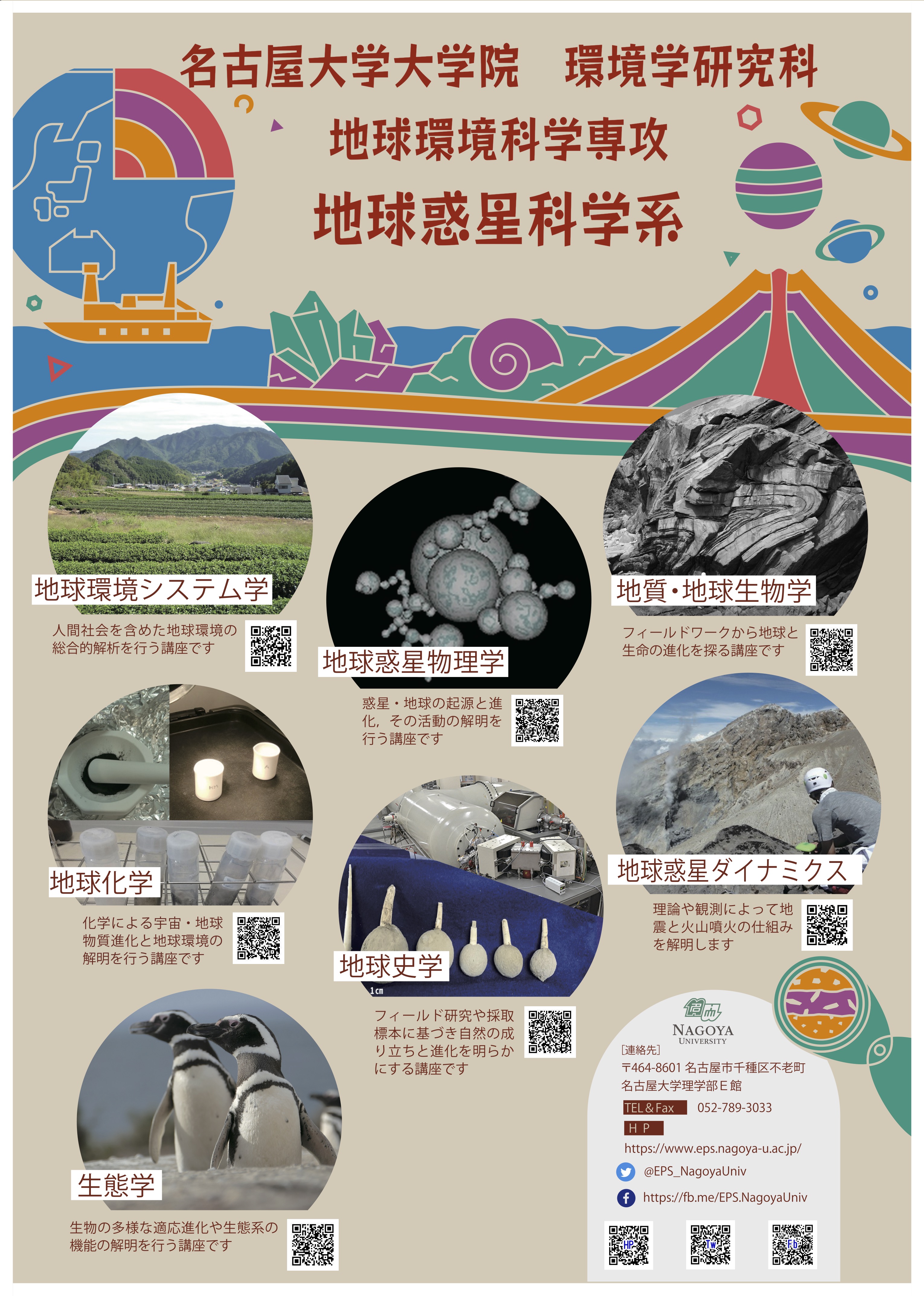 大学院の地球環境科学専攻には、地球惑星科学系大気水圏科学系の2つのコースがあります。この専攻には、宇宙地球環境研究所名古屋大学博物館減災連携研究センターや、研究科附属の地震火山研究センター持続的共発展教育研究センターの教員も参画しています。